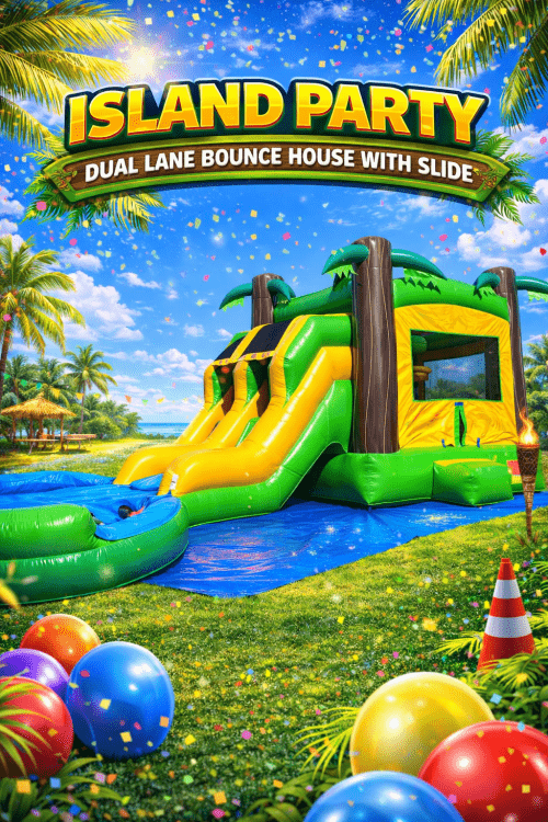 Dive into a sun-soaked adventure with the Tropical Party Dual Lane Bounce House w/ Slide! This vibrant inflatable paradise brings the tropics to any event, offering dual lanes of bouncing excitement and a thrilling slide. Perfect for kids and adults alike, it turns an ordinary gathering into an island-inspired fiesta. Feel the excitement as you race your friends down the slides, and bounce your way through an unforgettable day of fun and laughter. Ideal for backyard parties, school events, or any occasion yearning for a splash of tropical vibes and excitement.